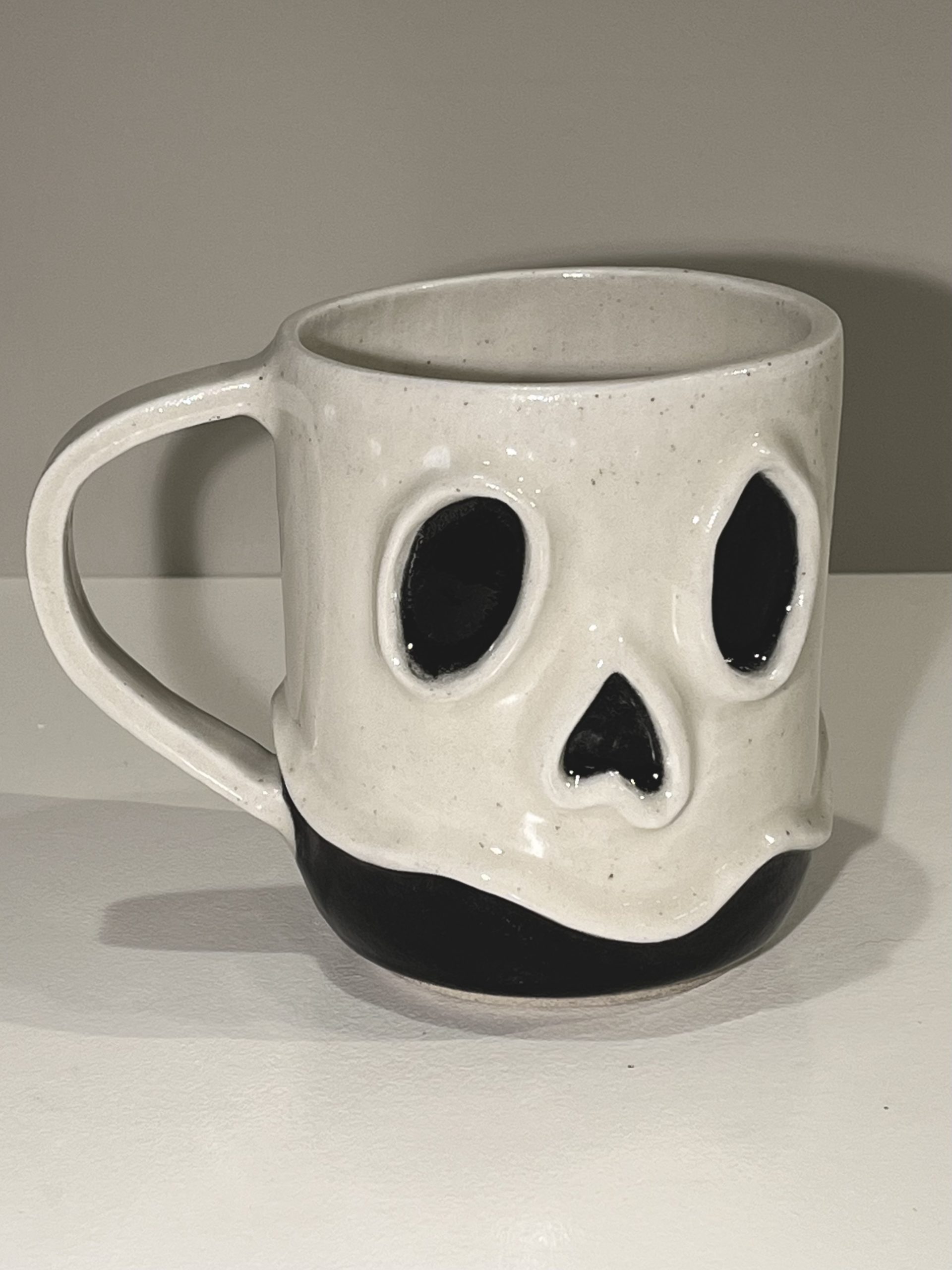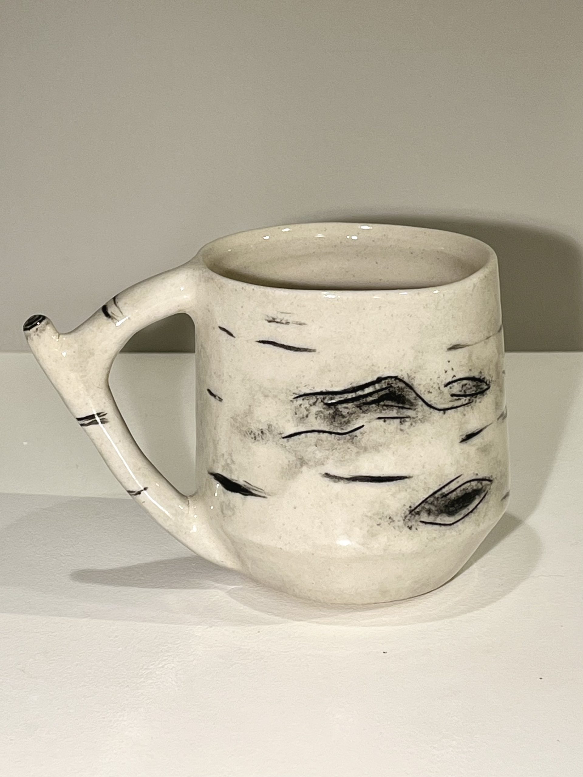 This mug replicates the colours and texture of birch bark. The interior is food safe for functional use, however there are several thin, hairline cracks on the handle that do not impact its use. These hairline cracks are filled with clear glaze and secure. Handwashing is recommended. The $40 price reflects the slight imperfections (a $15 discount off the regular price).