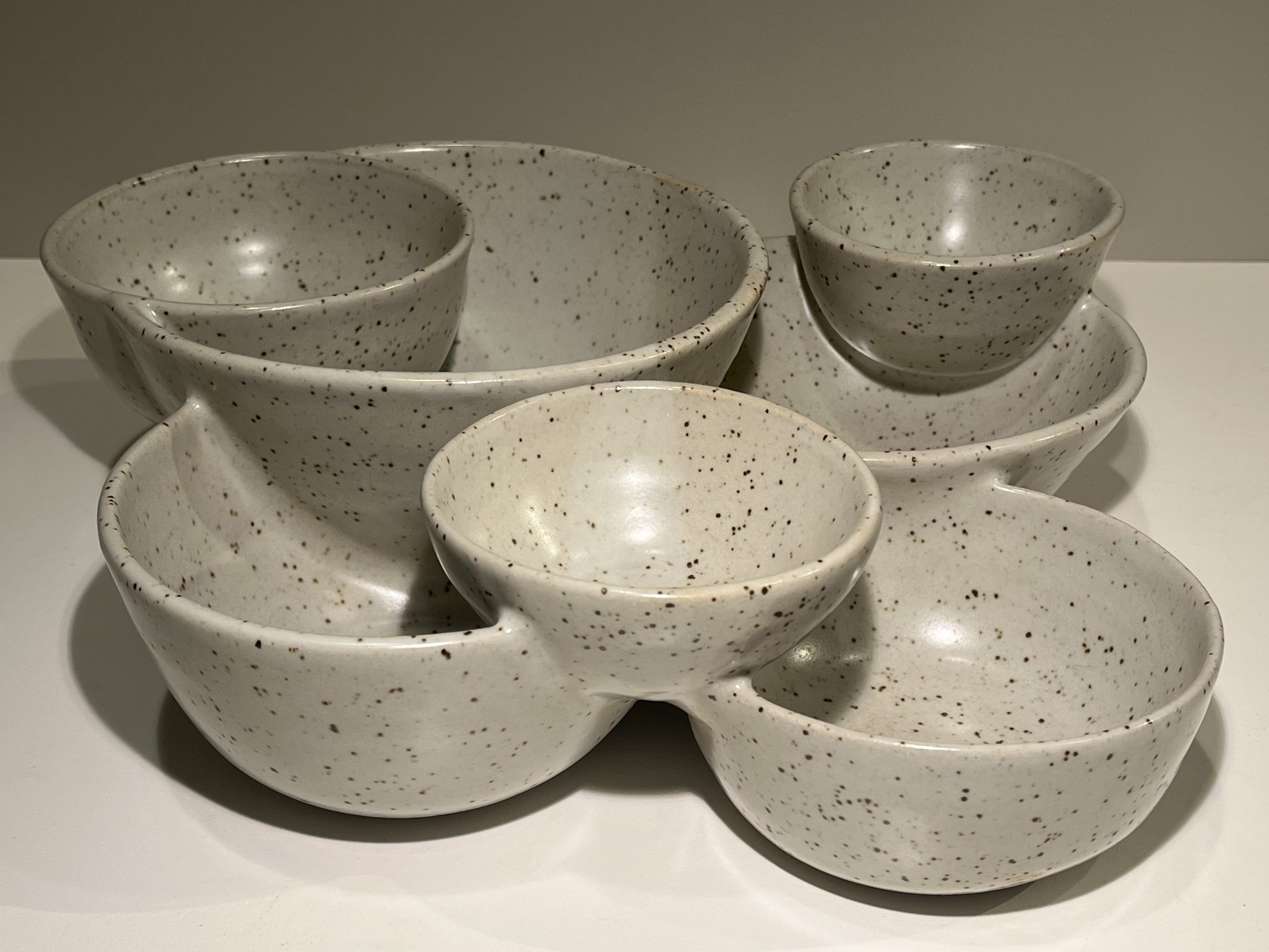 This charcuterie snack platter features speckled neutral glaze. The interior is food safe for functional use, however there are several thin, hairline cracks on the underside where some of the small bowls connect with the larger ones. These seams have been epoxied and the vessel is safe for use but should be hand washed to ensure long-term durability. This bowl is perfect for berries, olives, crackers, cheese and more. The $100 price reflects the small imperfections on the underside (a $50 discount off the regular price). These epoxied hairline cracks are invisible when the bowl is upright and in use.