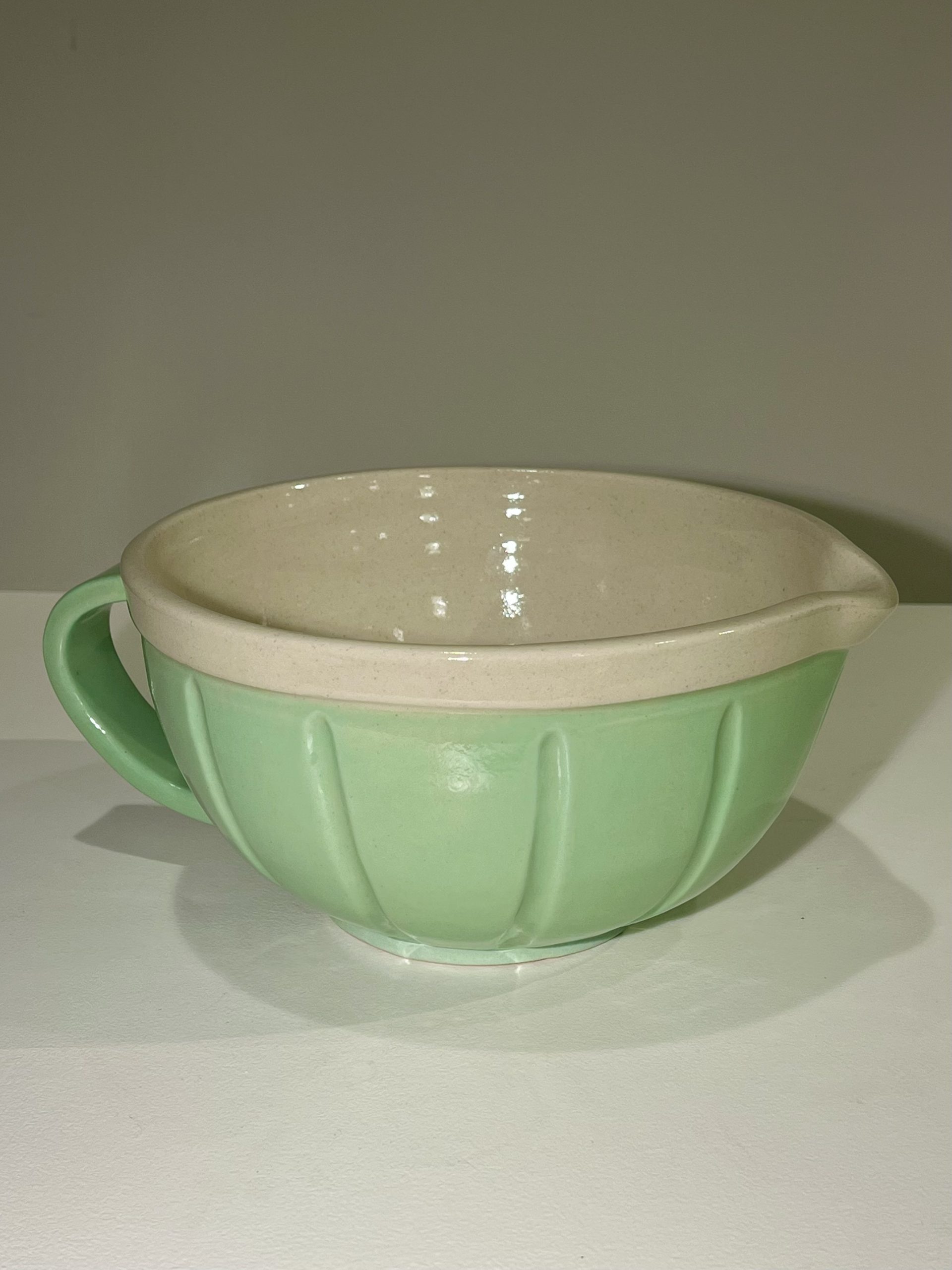 This large batter bowl features a mint green exterior and natural interior finished with clear glaze. It is food safe for both functional and decorative use.