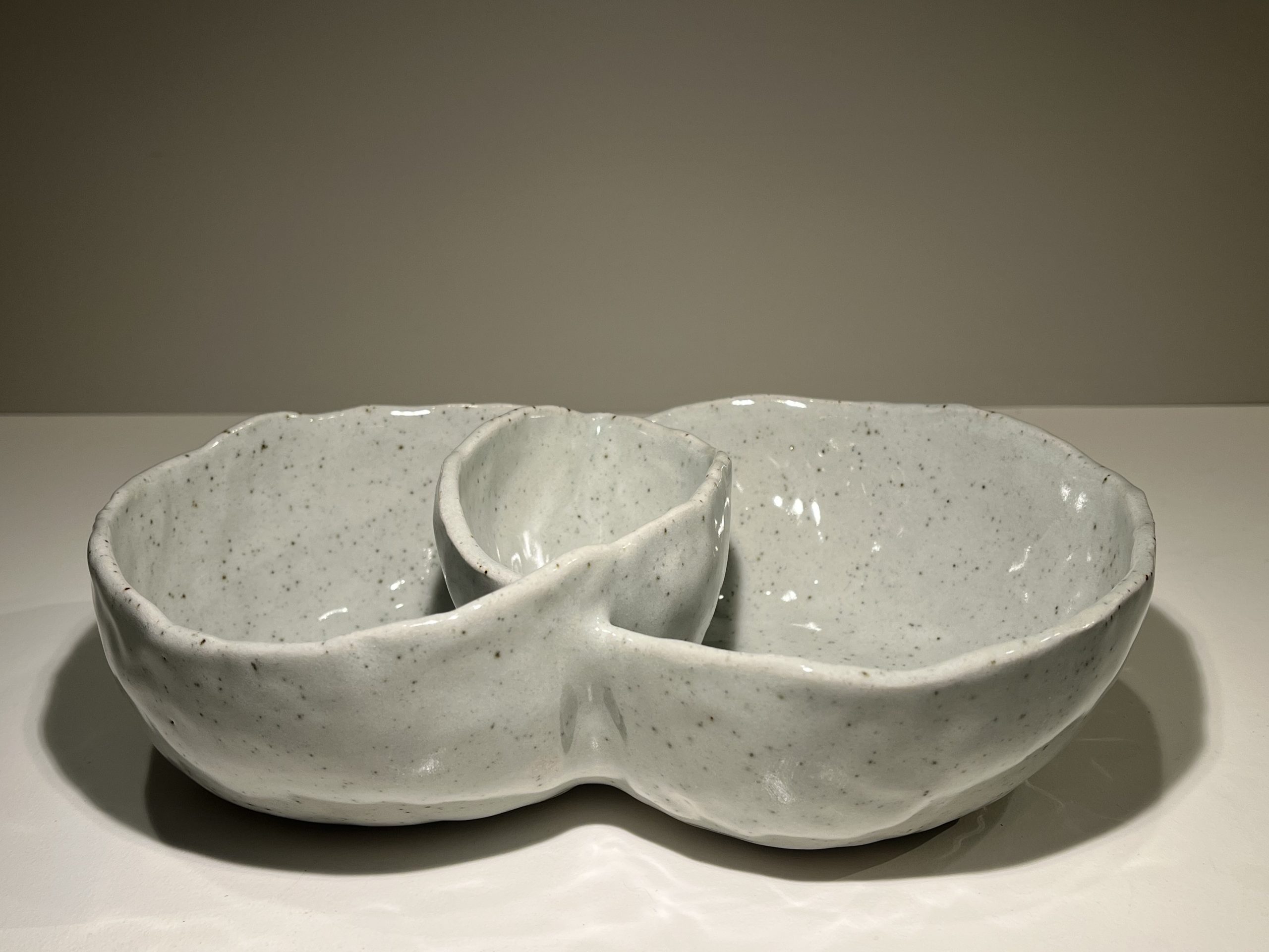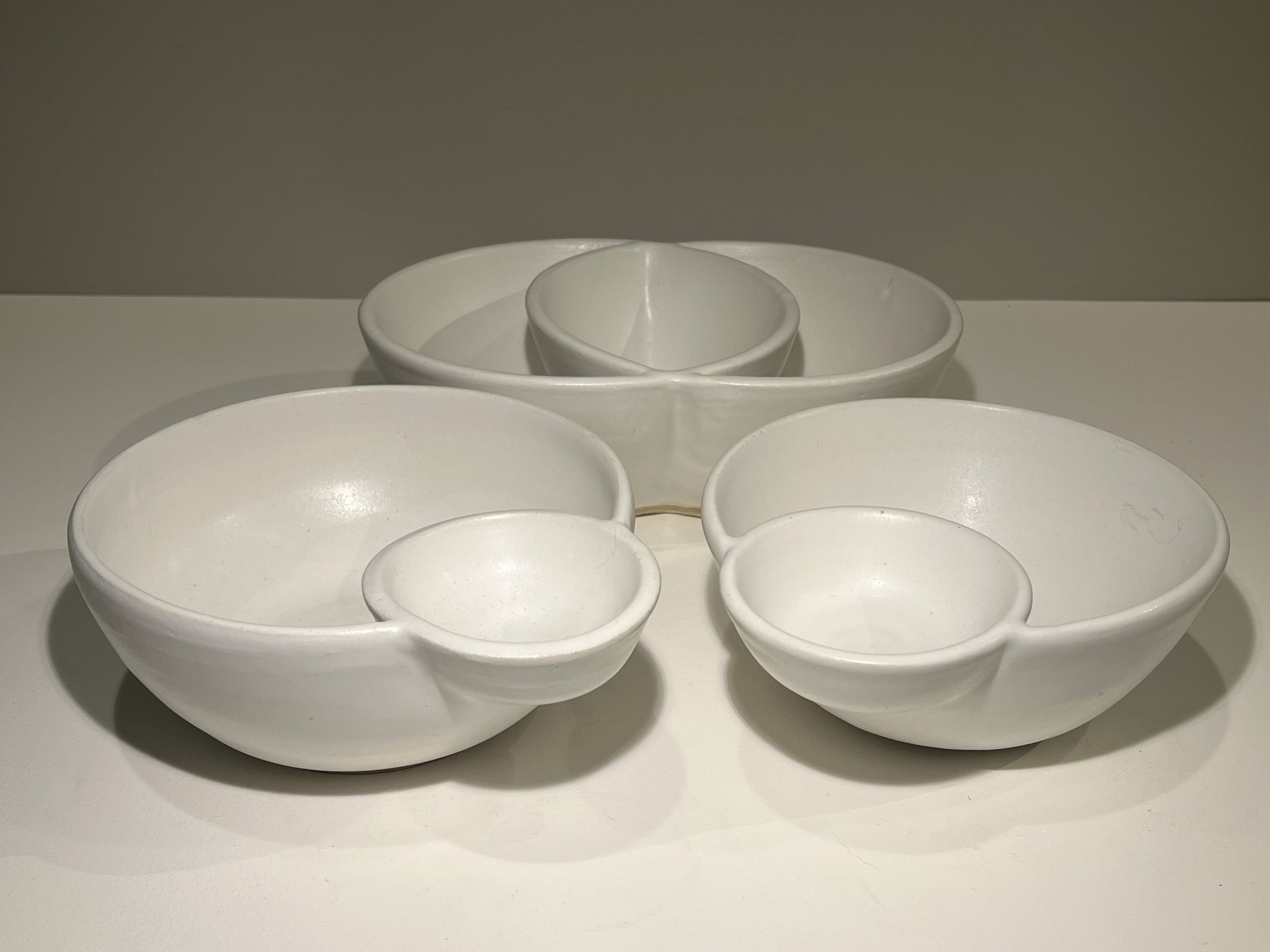 These snack bowls feature a white satin glaze. They are food safe for functional use. They’re perfect for cherries or olives and their pits, chips and salsa, apple slices with peanut butter and more. The two compartment snack bowls are $45 each and the three-compartment (venn) bowl is $55.