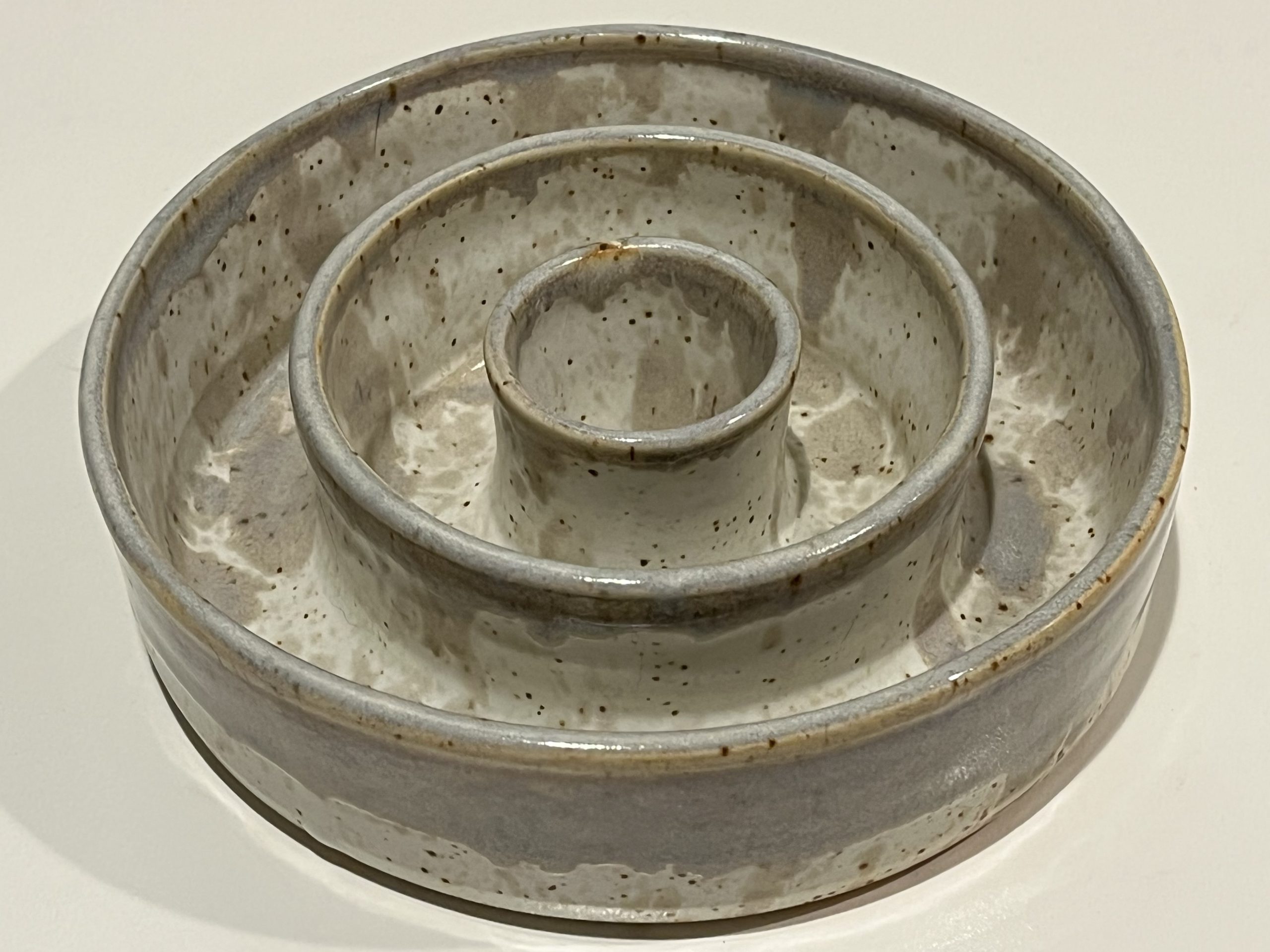 This slow feeder dog bowl is designed to help your pet slow down at meal times by introducing obstacles that can help prevent digestion issues. This bowl is finished in a satin white with rutile glaze. It is food safe for functional use. I can custom make these bowls to fit your dog’s meal size or your own colour preferences.