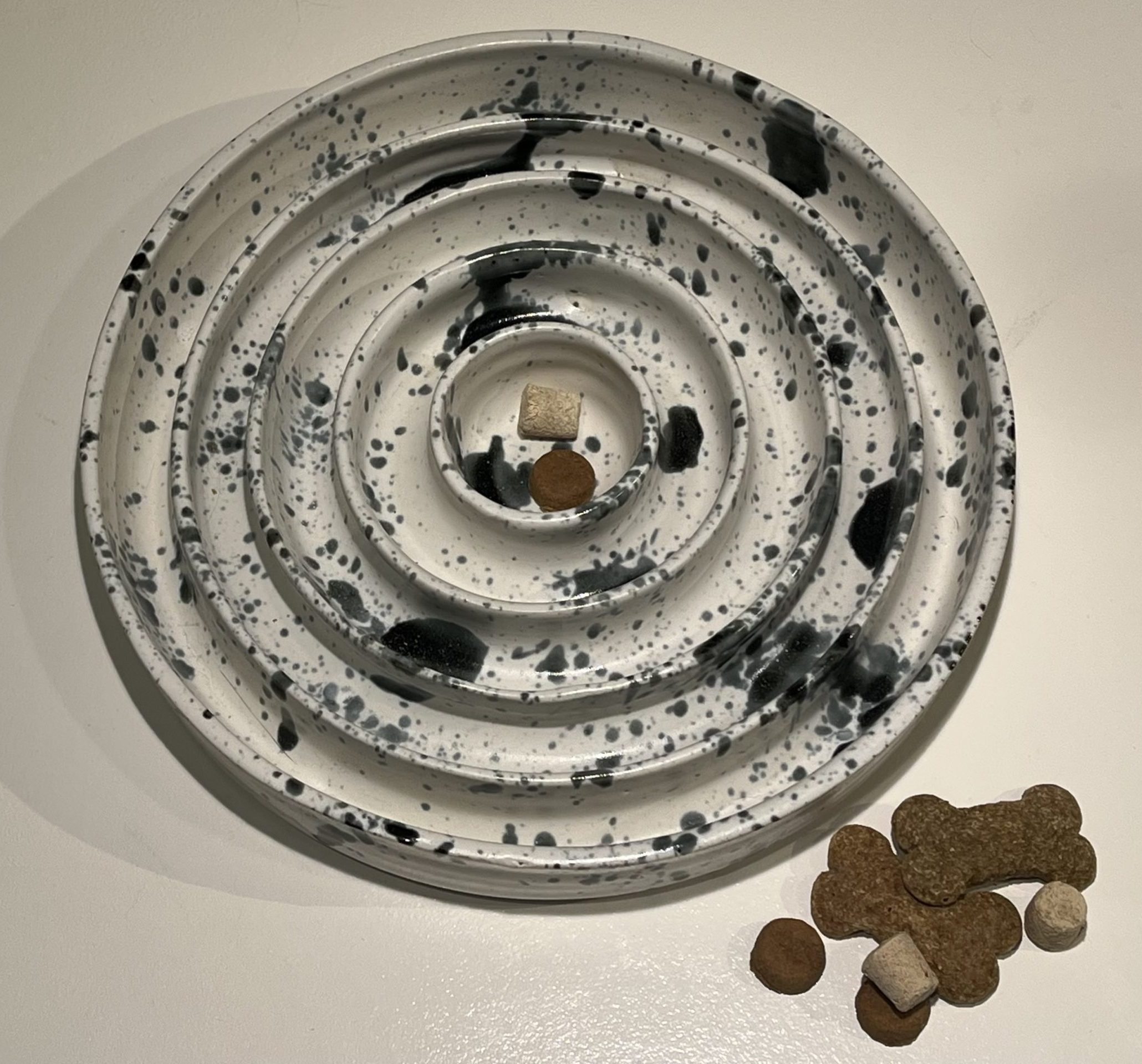 This slow feeder dog bowl is designed to help your pet slow down at meal times by introducing obstacles that can help prevent digestion issues. This bowl is finished in a satin white with speckles of black glaze. It is food safe for functional use.