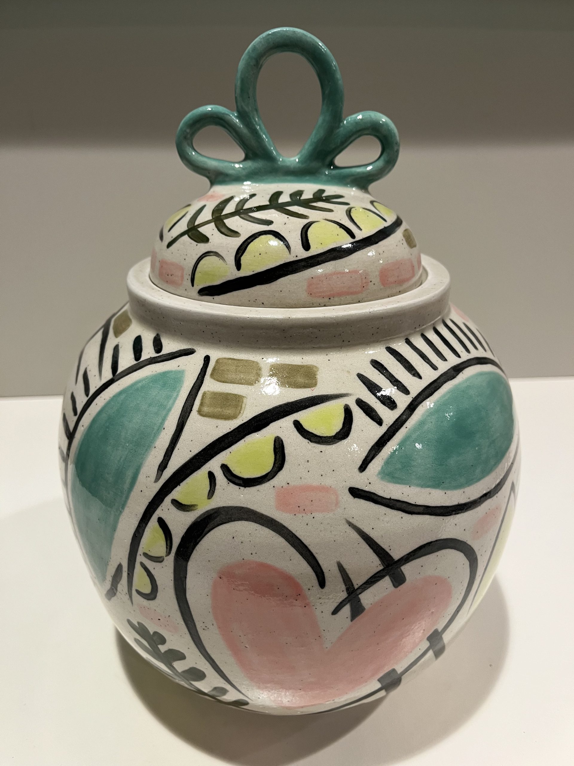 This large, hand painted cookie jar features a modern floral pattern on the outside and a decorative finial on the inset lid. It is food safe for both functional and decorative use.